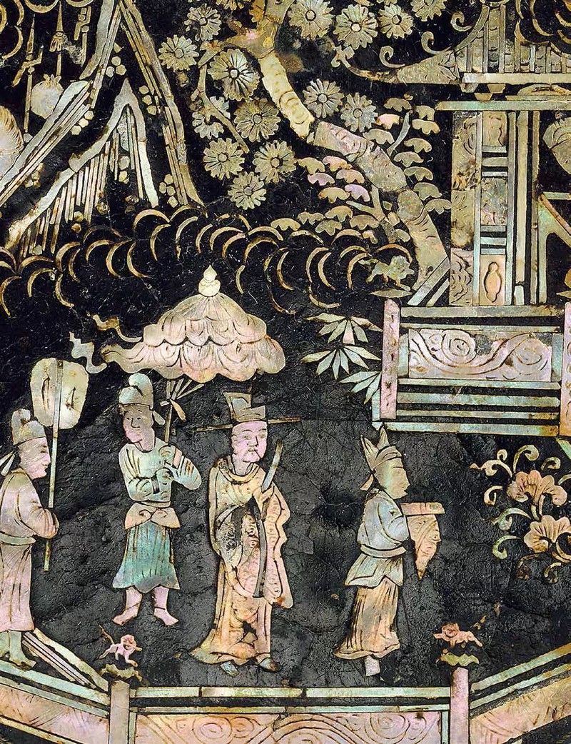 螺钿是用螺、蚌的外壳在漆器表面加以装饰的工艺,有厚螺钿和薄螺钿两种类型。厚螺钿镶嵌始于西周时期,至唐代乃臻妙境。宋元时期螺钿工艺精进,钿片渐薄,佳作迭出。主要景物所嵌钿片呈块状,并以浅刻来表现人物的神态、衣纹等,花草精细密致,意境如画。展品中宋元时期“黑漆螺钿楼阁人物图菱花形盒”“黑漆螺钿人物图圆盒”均为海外回流文物,国内罕见,十分珍贵。