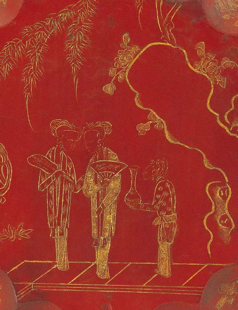 漆器的金饰工艺由来已久,品种繁多,主要可分为嵌饰与描饰两大类。唐代最为流行的金银平脱工艺,也归入嵌饰类。与金饰相关的漆器工艺最常见的是戗金和描金。