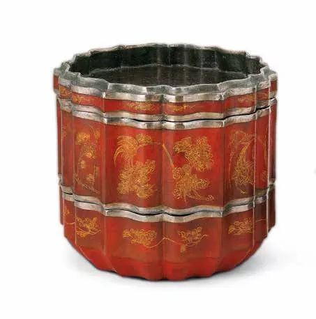 朱漆戗金人物花卉纹菱花形奁 南宋