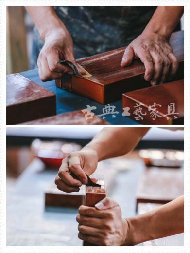 然后就是不断的上漆、打磨。依照想要的效果,上不同层数、不同厚度的漆;阴干,再上漆填平;再阴干,磨平。上漆道数少则十几道,多则上百道。一件漆器,绝对经过上千次的摩擦,千磨万彩绝不是夸张的形容。