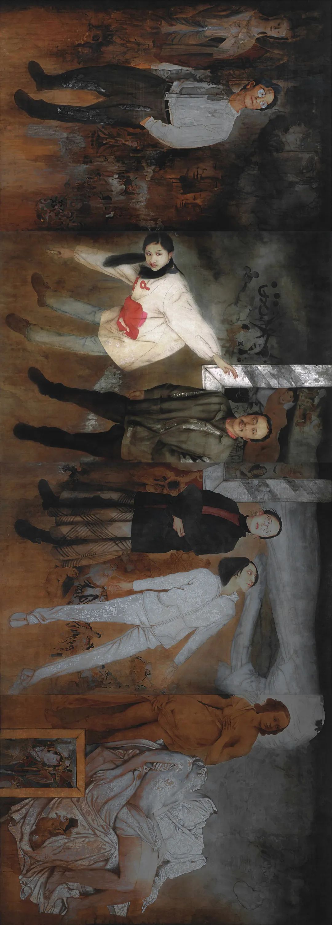 在他的画中,造型仍旧是第一位的,他以自己经过学院训练的造型能力严谨地刻画形象,用精微的高古线条塑造人物和景致。线条成为物象生成的基础,也构成作品结构的骨架。