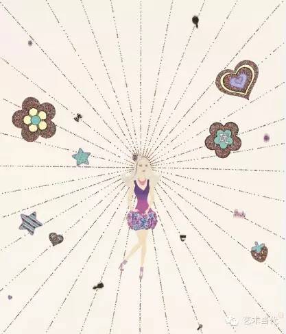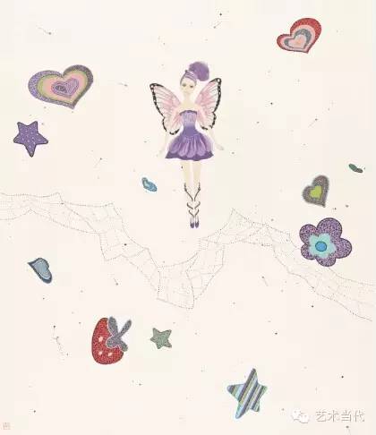 而对于泥古不化、墨守陈规的态度,韩峰同样是反对的,他认为这也是学艺不精、不得要领、不善消化所致。笔墨当随时代,他乐于尝试当下之新生事物、新鲜观念并纳入画中,比如他以往《中国制造》系列里的牙刷、运动鞋、芭比娃娃等各种工业品;敢于使用多为小女生所喜爱、有些庸俗化幼稚化的工业品如水钻,用着其中尤其颇为俗气、扎眼粉嫩的荧光色系(相当于工业颜料),去“彩绘”经典的国画图式,但最终呈现出了最新时尚流行色的鲜活靓丽,让古老图式焕发了逼人的青春活力和新鲜感。小到印章,他曾尝试将其颜色调淡即粉桔色,以配合画面的芭比娃娃等题材,现在干脆简化为一个朱纹圆圈,但依然委托了最好的篆刻家进行制作,印章的线条变化、留白、缺口及其画面位置等法度严谨,起到了平衡画面、完整构图的作用。乃至画作的装帧装框,他也结合现代居室和展厅空间的特点做了细致的调整。