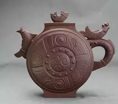 但我们在欣赏时为什么不会有笨重的感觉呢?妙就妙在提梁那硕大的圆环上,此一圆环所围成的“虚”的空间恰好在视觉上缓解了下部厚重的感觉。