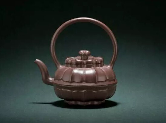 而且上下两个圆弧构成鲜明的虚实对照,使整体上让人感觉气势雄健,浑然一体,正所谓“周接四海之表,浮于元气之上”。这样大胆运用虚实的设计,还有当代徐汉棠的菱花提梁壶。可以说这款壶型的提梁所形成的“虚”空间更大,更空,甚至和“实”的部分不成比例,但由于身筒部分的形体饱满、筋纹刚健,再加上“虚”的部分本身有空灵之感,所以并不让人感觉有什么不协调。可以说这把壶是以实为本,以虚为用的经典。