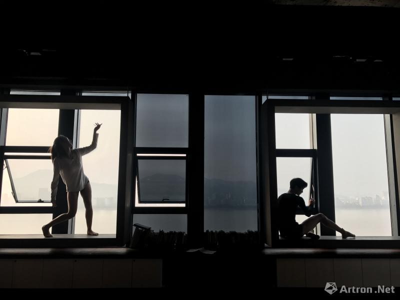 资深舞者周衍磊、思思受参展画作的感发,以七加艺术馆独特的设计元素——画框为表演空间,以窗外起伏的潮水和连绵的山脉为背景,演绎了即兴现代舞《云水》。