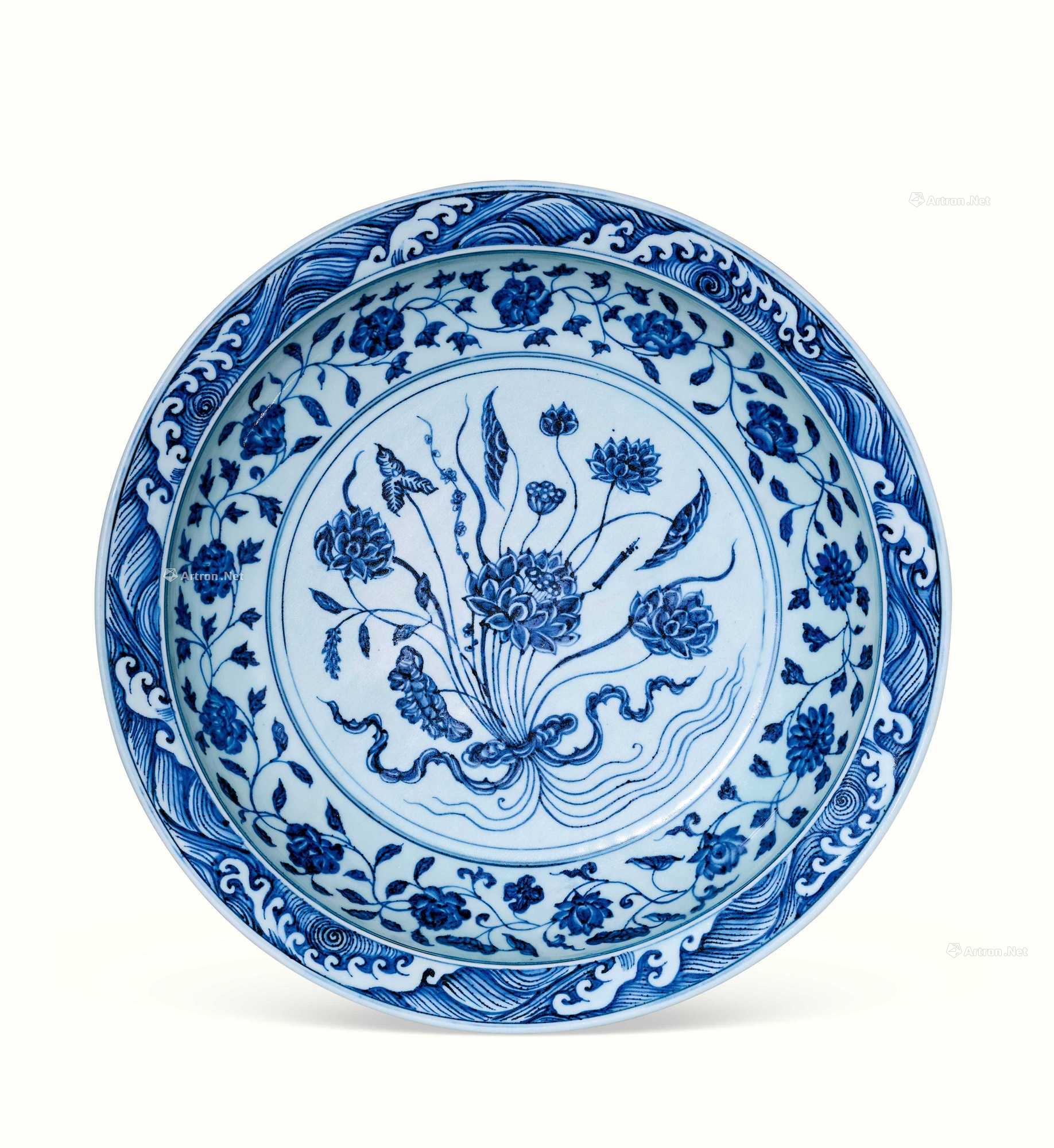这两件釉里红,就是罕见的艺术瑰宝,其造型和装饰技巧,均体现了明宣德景德镇制瓷工艺的最高水平。花口,浅弧壁,圈足。整个器物给人以端庄、秀美之感。此盘通体用釉里红描绘各种精美的花纹。内口沿处绘一周祥云纹,颈部绘有缠枝莲纹,内部的主题图案绘有花瓣纹饰,釉里红发色纯正、鲜明,釉色凝重艳丽。画面构图简洁明快,形象逼真,自然纯朴,这两件釉里红器物把完美的造型和釉里红的表现技法,统一在一个基调之中,在装饰艺术上达到了釉里红瓷器所能取得的最佳效果。