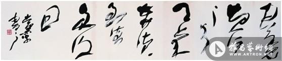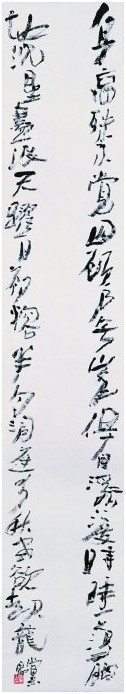 这幅作品与我平素的作品相较,无论幅式、章法、点画、结构、乃至气韵意味,大致相同,唯不同者,此幅涩笔飞白较为丰富、苍茫,变化更多更大,且更加窄长的幅式象宽银幕电影一样,更具波澜壮阔的视觉画面。显而易见,此幅格调气势及其自由自然的意境和形式更具峭峻、劲健、大气磅礴、黄河落天般的雄伟意境。以书法的艺术形式,为李白的潇洒风流、唐代的雄强豪放作出了形象贴切的注释。