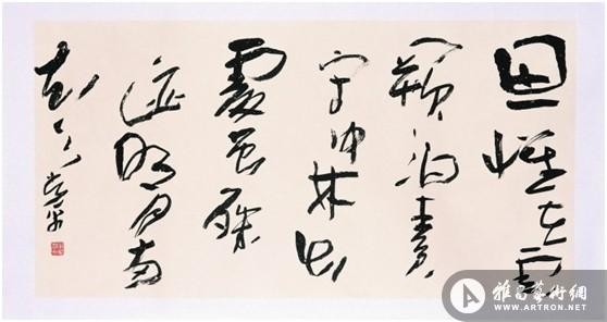 这是一幅几乎被丢弃了的作品。它出生的本意,仅仅是为了蘸去原作上渗漫多余的墨汁。原作交了出去,得了大奖,但这张吸墨纸却意外的没有揉成一团扔掉,反倒越看越觉得有味道。似乎作品中那飞沙走石、狂风飒飒的感觉,比原作更好。我仅仅觉得:“风”的最後收笔,似乎不该往上提。哪知几年後,一经展览、发表,艺术界、学术界专家学者好评如潮,《狂风》成了我“狂”的注脚,“狂”的经典。那最後的上行之收笔,也有了它最好的也是最合理的美学存在理由——“充满激情,却不滥情”。