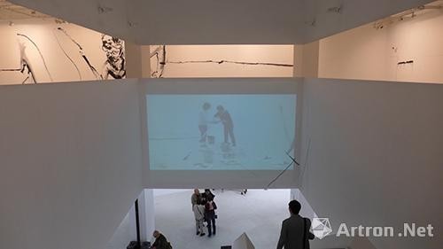 他一个人站在诺大的展厅,走走停停,时而用手在空间中笔划;时而环顾四周 叉着双手,若有所思;整个展场寂静无声,只剩下走过踩着地上泡沬的沙沙声。