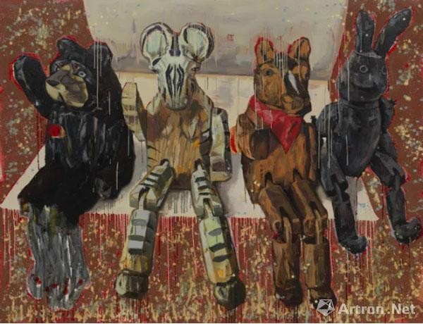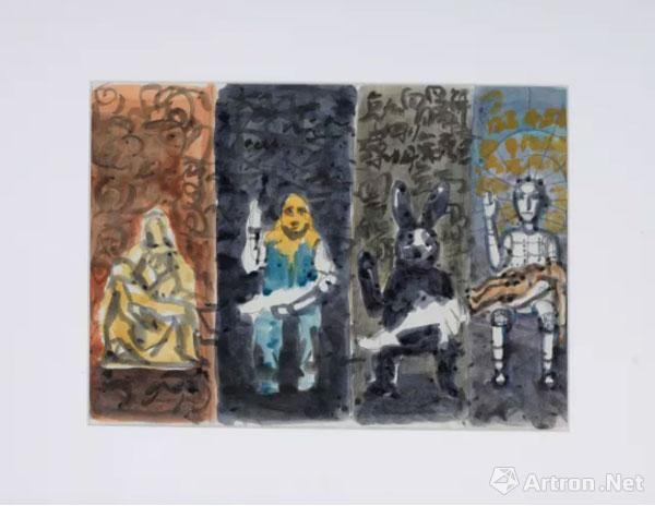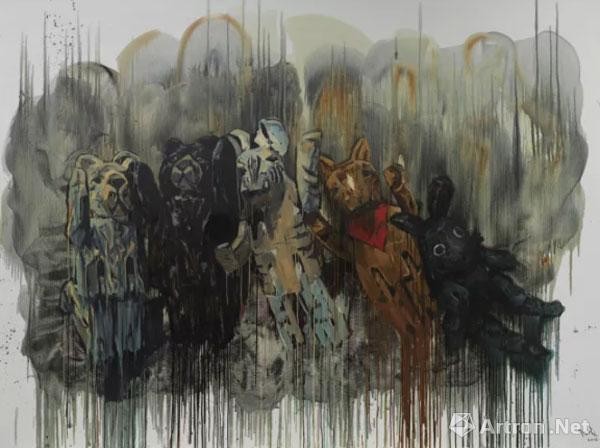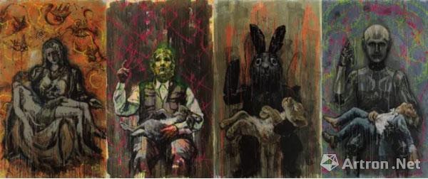 《黑兔还在跑》布面油画 230×150cm×4 整体尺寸:230×600cm 2017年