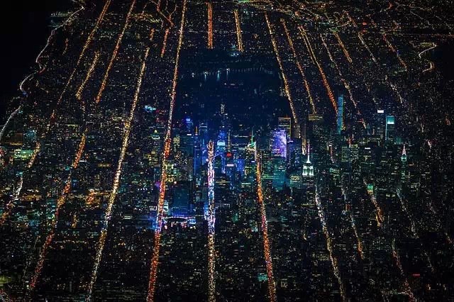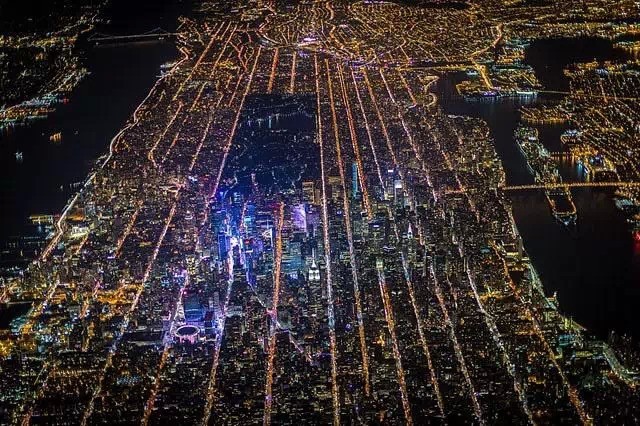 初看作品会有种错觉,夜色中航拍的纽约就像集成电路板一样,一幢幢高楼好像电路板上的晶体管、电阻器等。这样的高度之下,陆地的轮廓、港湾的形状都清晰可见,纽约的城市街道像被火线贯穿,整片土地像是暗夜中的一盏明灯。