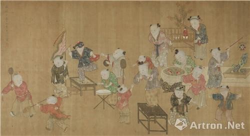 《戏佛图》明 陈洪绶 左上角一小孩儿头戴红抹额