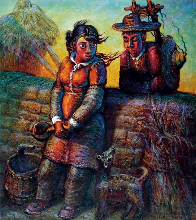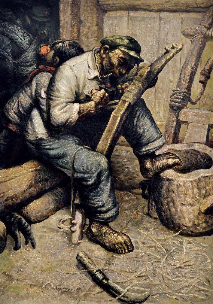 罗中立笔下的农民有着一份真生活:有沉重劳作的苦,有合家围坐着火塘的乐,有夫妻风雨同舟的爱,有母子舐犊殷深的情。这苦、乐、情、爱,却都有一种川味,一种麻辣辣的生活趣味。这骨头里的表情被罗中立化为一种日常性的生动叙事,一种夸张的视觉捕捉和强化,一种罗中立式的精神承受。