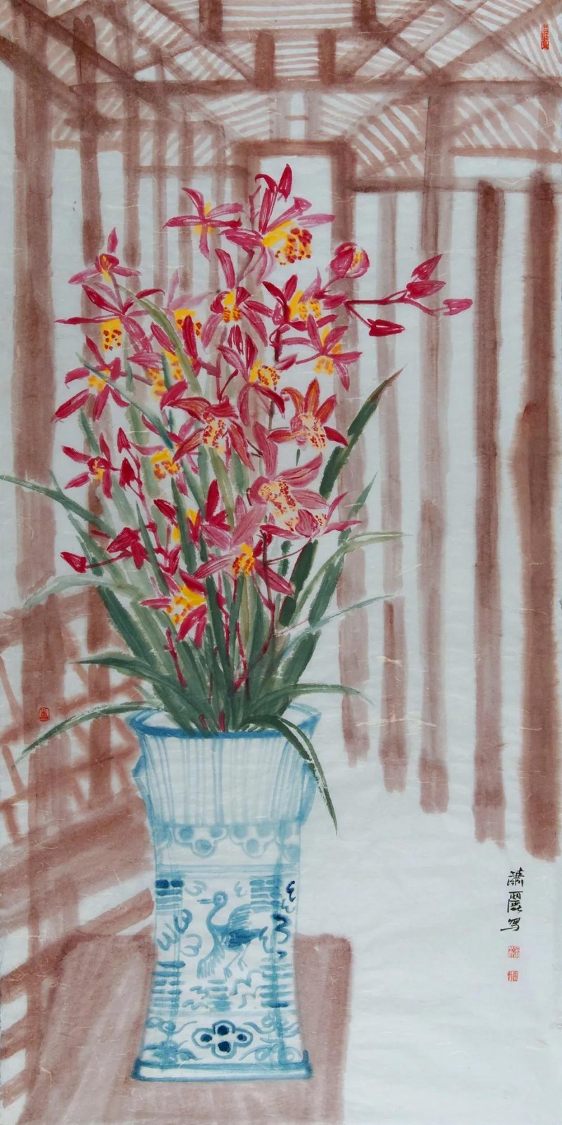 此幅作品《无题》中,设色明亮雅致,布局精美而简约,构图疏密有序。瓶中花卉恣意昂扬,傲然而闲逸地吐露着专属于自己的光辉,垂落的花枝似与旁边的棋盘相拥相吻,相互赞叹着知音难觅,知己难求......画家通过简约的静物描绘,以一张一合之姿,含蓄透露出画者细腻、婉约的个性表达,巧妙地为观者呈现出充满视觉张力和艺术创造性的花鸟艺术,静静品赏,令人动容动心。