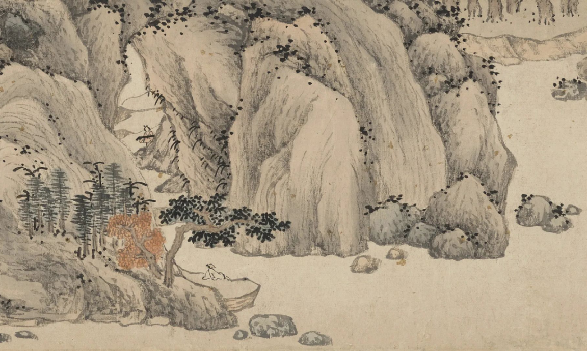 扇面以白宣与洒金笺相间,白宣作画,洒金笺写书法。一面为张大千绘竹阴高士、节录《前赤壁赋》,汪慎生绘枯木栖禽、书明代徐有贞《题画》诗;另面为于非闇绘折枝墨梅、书苏东坡《菩萨蛮》,张善孖绘秋林白马,吴湖帆书杜甫《七月一日题终明府水楼》诗句。绘画题材各不相同,人物、禽鸟、花卉、山水走兽俱齐,多纯以水墨出之,仅张善孖一段略敷白粉、赭石,素净淡雅。一扇之中呈现出诸家早年面貌,实不易睹,尤其于非闇早年小写意画作流传较少,“画又次之”闲章亦鲜见。1934年,吴湖帆受故宫博物院之邀,赴北京鉴定书画,此扇书法即应作于期间,故有南北名家共谱一箑的情形,颇为珍贵。