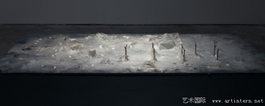 Liang Shaoji 梁绍基, Snow Cover No. 1雪藏 No.1, 2013-14,Silk, cocoons, paper cup, plastic cup, metal, board丝,茧,纸杯,塑料杯,金属,木板,17 x 122 x 244 cm