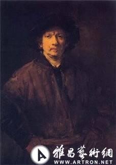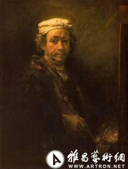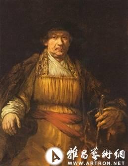 晚年的伦勃朗已经很难再卖出去自己的作品了,逐渐喜好巴洛克那种繁复和华丽风格的阿姆斯特丹人已经失去了对他这种粗犷而富于深邃思想的画风的兴趣,画家此时的创作可能只是为了自己的精神表达。为谋生路,画家不得不经常制作较为廉价的铜版画出售,但是制作铜板画时受到酸液的毒害,使他的视力开始变得糟糕。尽管这些都没能造成伦勃朗艺术上的衰退,但对于一个画家来说,身体健康的恶化无疑会影响到他的创作。我们在绘于1660年的《自画像》中可以见到进入老年的伦勃朗的形象,他左手握着调色板与画笔,右手叉在腰间,一副不修边幅的样子,头上缠着头巾,衣饰和苍老疲倦的面容显露出一种贫穷与寒酸。由于常年坐着画画,他的身材变得臃肿而虚弱,只有一对眼睛还炯炯有神,他冷冷地伫立在画架前,没有一丝笑容,好象正从全神贯注的工作中抽身小憩,似乎在沉思,又似乎在小憩。光线集中在他的白帽子上,这样把我们的目光都吸引到了画布的上方。伦勃朗在脸部处理上通过柔和的中间色调保留了明暗的微妙变化,这样极有效地暗示了情绪。最为精彩的是对嘴唇的处理。在此画中,伦勃朗是一名对自身容貌冷静而深思熟虑的观察者他拿着作画支腕杖的右手因为暗示了短暂休息的动作而引人注目。画家与画架之间的空间以及这种安排中引出的垂直线与对角线,是有意识地探索构图的原理。在不减弱画头部的艺术感染力的情况下,他凭借调色板和画架边缘的辅助光把观众的兴趣扩展到整个画面。背景被淡化了,突出了画家的上半身,像一座塔一样巍然不动,也许在他身上只有艺术的生命永恒地维系着他。在技法上,画家只用简约、阔大的笔触去雕琢他的内心情感,表情的严肃正是他忍受着日益困窘的生活的外在反映。色彩上,伦勃朗进一步简化了色彩的色相,以高度统一的暖色调构成整个画面的色彩体系。伦勃朗在大胆的构图上找到了最有效地表现他不稳定情绪的途径,如帽子的强烈对角线和笔触的猛烈爆发式的特征。把此画与伦勃朗在莱顿期间创作的任何一幅的表情相比是有趣的。与他作于1630年的那幅铜版肖像相比,这幅作品显示出他晚期作品中包含的自我审视和对人类不幸命运的深刻意识。在旱期作品中,伦勃朗只描绘了自己对某些孤立事情的反应。而现在,伦勃朗则把自己的经历与人类生存的普遍的不安全因素紧密地联系起来。,伦勃朗作于1660年,现存伦教国立美术馆的另一幅肖像和存于华盛顿的那幅在构图上没有什么差别,真正的差别在于画家在情绪上的表达。在前者,画家以略带讽刺性的幽默表情看着我们,表现出伦勃朗坚韧而不甘屈服的个性,但这幅自画像中,步入暮年的艺术家仍具有富于人情味的内心世界。(图24)