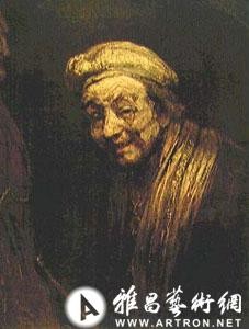 伦勃朗的视力从60年代起严重衰退,他觉得画油画比刻铜版更方便些,但他涂得很厚,笔法也更豪放。每一笔都是他那敏锐的观察力的体现。他们把光源集中在最重要的部位,让其他细节湮没在微弱的阴影中。现藏于乌菲齐博物馆和藏科隆博物馆的两幅肖像是最后5年内的作品,前一幅约作于1664年或1665年,后一幅则是更晚的作品,大约是1668年。藏于乌非齐的那幅作品其宽宏的正画面和装饰性的服装,在构图上相似于文艺复兴时期马布斯和荷尔拜因的肖像,但画面中强烈的明暗对比又显然是巴洛克式的,画中人物的表情依然是忧郁的,但他在此是以毫不妥协的态度来表现他优郁的情绪,一种近乎冷漠超然的神情与其它后期自画像的温和安详明显不同,除了那些作品所共有的庄严特征外。创作于1668年的《自画像》笔法已臻化境,厚涂的色彩如同铸铜般闪闪发放,生活的连续打击,已经让他丧失了对未来的一切希望,他的第二任妻子亨德丽吉在1663年去世,他又不得不回到劳莱尔渠畔的住宅区。伦勃朗本人在这幅画上是显得那样苍老:他披着旧衣,眯缝着眼睛,嘴巴微张,唇边带着一丝苦笑,眼里充满着哀愁。画家这时已孑然一身,在这一年,他和莎士基亚的儿子泰塔斯也在十月去世。生活的连续挫折与事业的打击造成了画上那个伦勃朗形象,画家把自己从肉体到精神的形象,都勾画在这幅画上了。值得注意的是,在科隆的那幅自画像中,老伦勃朗驼着背站在他的画架前面,带着一条宽大的丝围巾,闪着金黄的色调,如同一块布披在他的左肩上,画架上的半身人像隐约可见。伦勃朗在这幅画中是以大笑的面目出现的,“这种表情使我们回忆起弗朗兹•哈尔斯(FransHals)的欢快面孔”。有研究者说,伦勃朗在此把自己表现成狂笑不止的德莫克力斯(Democritus)正在绘制流泪的赫拉克里斯(Heraclitus)。但这种大笑在我看来,却隐含着一种悲剧的含义,有的时候,大笑反而具有悲剧的意义。在画中,我们感到画家那种哲理性的优越感和机智,同时也有一种心力衰竭的迹象。粗犷的厚涂画法和纯粹的自发性的笔触,是伦勃朗绘画技巧天才的有力见证,他的笔法更苍劲老练,厚涂的色彩像铸铜一般在闪闪发光。他采用的是一种略显透明的“色彩重置法”。这种画法使我们想起了于1650年画的那一幅《戴金盔的男子》,而现在这幅画上的运笔似乎要胜过当年为他戴头盔的哥哥画的那一幅画。在1669年的一幅自画像中,伦勃朗去世的那年,艺术大师那极富表现力的风格才有所衰弱,但他的绘画技巧依然炉火纯青。和其它所有晚期给人印象深刻的自画像相比,这幅作品如同速写般的流畅和轻松,画面上不再有传统意义上的美感,笔触犀利甚至粗暴,色彩变得单纯而铮铮有声。此时的伦勃朗油画作品已经完全使普通观众无法琢磨其表达意图,或许在画家心中,曾经真实而绚丽的世界表象已经模糊,留下的只是生命在升华中与世界自发的交流,或许这就是“神遇而迹化”的境界。(图26)