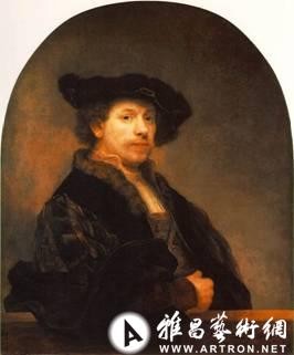 在最早创作的自画像中,创作于1629年的《自画像》具有代表意义。画中的伦勃朗右侧看着观众,他年轻的脸上还有点稚气,但目光坚毅,炯炯有神,充满着对未来的期望。很显然,画家此时的绘画技法已经相当娴熟,画中的用光尽管还没有像成熟期那样具有戏剧性效果,但其中的明暗过渡和衔接已经十分自然。在作于1630年的一幅名为《侧身观望的未戴帽子的伦勃朗》的自画像中,年轻的艺术家以充满活力的动作向观众行注目礼,表情严肃而自信。画中的伦勃朗蓬松杂乱的头发用极其熟练的笔触画出来,黑色的卷发披散在被强光照射的面部两旁,“从鼻子的上方成对角线掠过右边脸颊的阴影,以及乌黑的眼睛,锐利的目光和拧在额头紧张的肌肉都增强了戏剧性的表情”。伦勃朗在创作这幅自画像时才23岁,但他的技法却没有不成熟的迹象,画中的明暗关系在画家的控制下成为强调心理内容的手段,画中自由放纵、随意的线条既是对人物的描绘,又具有精神的暗示意义。在创作于1630年的另一幅肖像中,画家运用强烈的光线照射在这位年轻艺术家凝重的、年轻的脸上,艺术家没有故意去隐藏或修饰他的面容,而是忠实地表现出自己粗犷的外表和坚毅自信的表情。这幅作品和伦勃朗大部分的自画像一样,艺术表现的直率是令人惊讶的,大胆的构图风格亦是如此。在色彩上,画家以柔和清冷的色调,娴熟而生动的笔触,勾画出一个前程远大的年轻画家的相貌。另外一幅创作于1629年的自画像更像是对一个场景的描绘,在这幅画中,近景是一个逆光的画架,在其正对面,是画家全身像,光线从画面的左边射入室内,画家的脸部一般笼罩在阴影当中,他带着宽宽的圆帽,身披长袍,左手拿着调色板,右手握着画笔,好象正在全神贯注地观察光影的变化,画面色彩柔和而宁静,近似于单色,明暗变化微妙而有节奏。这件构图奇妙的作品,完全打破了人们对自画像的固定思维模式,空间在这里被画家轻松地扩展开来,在似乎空旷的画室内,一个正在琢磨和思考的画家,站立在光影中,使得画面具备了一种令人捉摸不透的氛围。(图18图19)