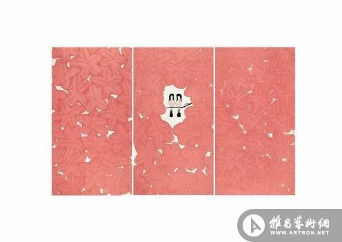 这一幅作品是《万紫千红》花鸟当中画的比较多的,很多人喜欢这幅画,特别是在喜庆、结婚的时候。因为它的色彩比较亮堂,用很时髦的语言就是时尚、阳光,其中红色非常雅致,所以人家就很喜欢。这个红色是用的英国水彩的一个颜色,是在很多中红色中挑选出来的,它的特点就是雅、鲜。从效果上来看,大家感觉叶子中间的叶脉不是我画出来的,而是水分两面因为宣纸的特点晕开来,两面一运开来中间就变成这样了,这种画法就是很自然的效果,同时带有一点设计性质。