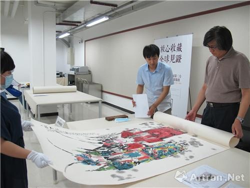 此次鉴证备案藏家所带来的作品依然是经过前期两轮的筛选之后而确定。在前期沟通中,雅昌艺术品鉴证备案中心将海选作品图片提交给马书林先生,首先对作假方式和手段甚为低劣的伪作进行淘汰。之后则携带作品进行现场鉴定,首先要过的一关是“工业制品”检测,由雅昌艺术品鉴定中心的工作人员用高科技仪器对画面肌理进行检测,将属于印刷品和高仿艺术品等工业产品的可能性排除。