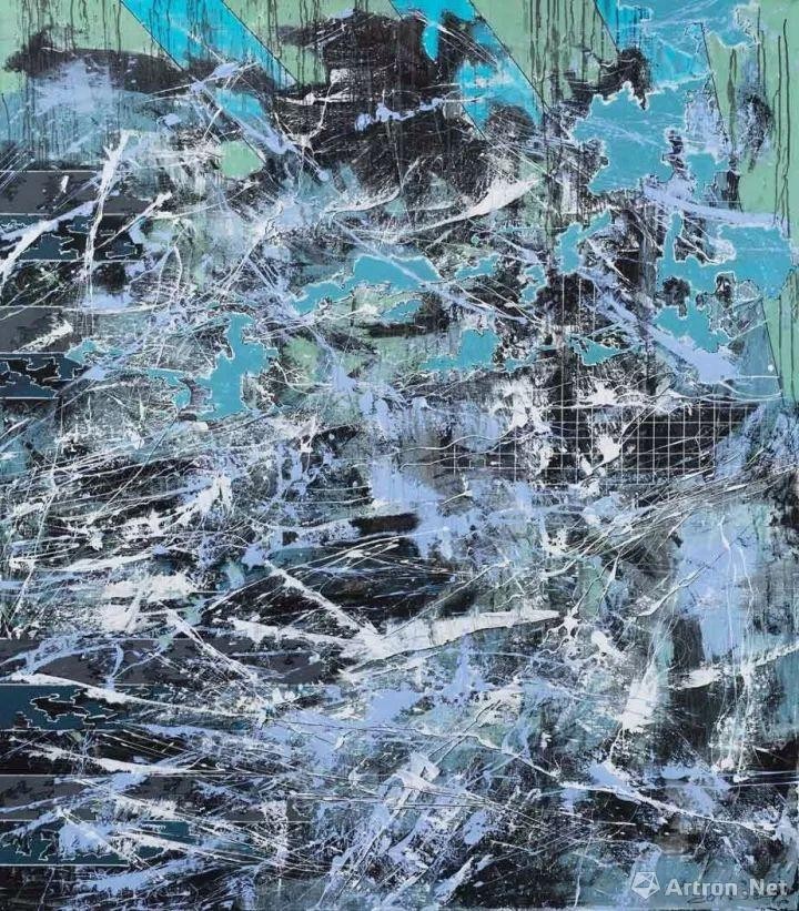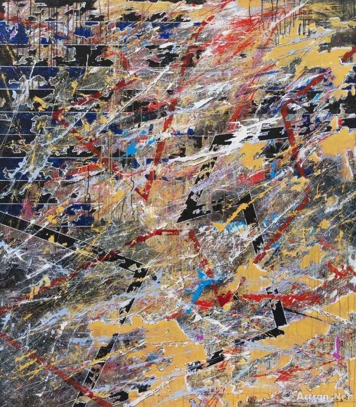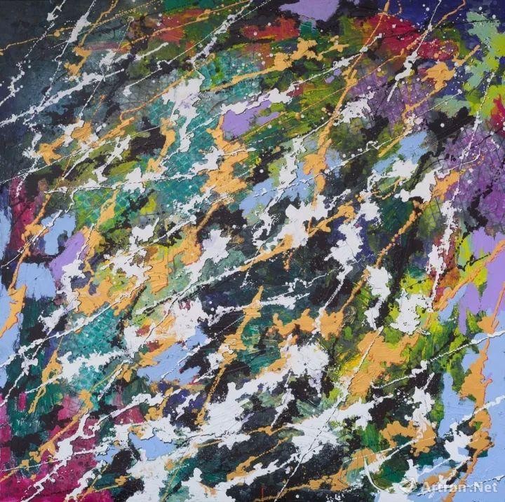 赵旭先生的这种艺术情怀也是中国社会发展的象征。中国的改革开放为他施展艺术才华提供了现实支持,形成了他宽阔的文化视野和敏感的艺术关切。他熟悉中国艺术发展的历史与传统文化的特征,也研究西方现代以来的绘画革命和新艺术形态,因此,他的艺术呈现出一种当代的“中西融合”样式。他善于营造画面的节奏与旋律,既注重整体的结构营造,把握住视觉的张力,又用极为密集的色点,在图绘与甩滴相结合的手法中,使作品拥有丰富的质地,在“远”与“近”、“大”与“小”之间形成跌宕起伏的恢宏视界。在某种程度上,可以将他的作品视为一种文化现实的象征,其中充满了如同中国社会发展的变迁与速度,又可以看到他从纷繁的世俗社会转向纯粹的心理世界的态度,他以一种超越性的情怀走向单纯的精神境界,在那里找到艺术表现的快乐,也为我们提供了可以跨文化解读的视觉文本。