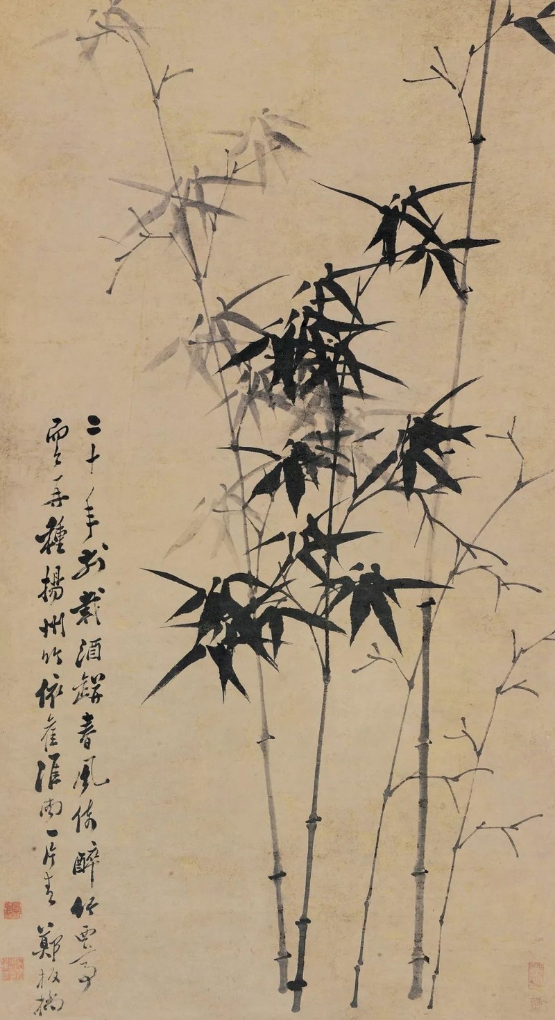題識:二十年前載酒瓶,春風倚醉竹西亭。而今再種揚州竹,依舊淮南一片青。鄭板橋。