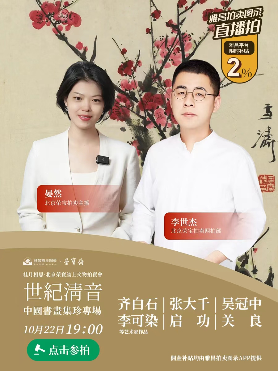预展时间 7月2日10:00—7月3日10:00 拍卖时间 7月3日10:00—7月5日21:30 (点击下方图片,进入专场参拍) 北京荣宝·见山——案上赏石专场(二)网络拍卖会于7月2日10:00—7月3日10:00开启线上预展,并于7月3日10:00开拍,7月5日21:30结拍。 作 品 赏 析 杨晋款“幽道”太湖石 L:26cm 说明:此作品附北京荣宝拍卖证书。 “探云”太湖石 H:25cm 说明:此作品附北京荣宝拍卖证书。 “听空”风砺石 H:28cm 说明:此作品附北京荣宝拍卖证书。 倪田款“玘云”灵璧石 H:35cm 说明:此作品附北京荣宝拍卖证书。 罗聘款“通灵”太湖石 H:22cm 说明:此作品附北京荣宝拍卖证书。 “逸岫峰”英石 H:25cm 说明:此作品附北京荣宝拍卖证书。 陈寿祺款“坠秀岩”灵璧石 H:25cm 说明:此作品附北京荣宝拍卖证书。 “佐岳”太湖石 H:25cm 说明:此作品附北京荣宝拍卖证书。 黄易款“涧云峰”灵璧石 H:39cm 说明:此作品附北京荣宝拍卖证书。 “终南雪霭”昆石 H:27.5cm 说明:此作品附北京荣宝拍卖证书。 “聚云”太湖石 H:36cm 说明:此作品附北京荣宝拍卖证书。 “观月”太湖石 H:24.5cm 说明:此作品附北京荣宝拍卖证书。 “笔架”灵璧石 H:13cm 说明:此作品附北京荣宝拍卖证书。 灵壁石厅堂摆件 H:50cm 说明:此作品附北京荣宝拍卖证书。 英石案头清供“云芝” H:21cm 说明:此作品附北京荣宝拍卖证书。 太湖石山子“达观” H:23cm;长23cm 说明:此作品附北京荣宝拍卖证书。 英石山子摆件“避雨岩” H:25cm;长28cm 说明:此作品附北京荣宝拍卖证书。 黑太湖厅堂供石“皱云” H:88cm 说明:此作品附北京荣宝拍卖证书。 原配座英石清供“耸云” H:57.5cm 说明:此作品附北京荣宝拍卖证书。