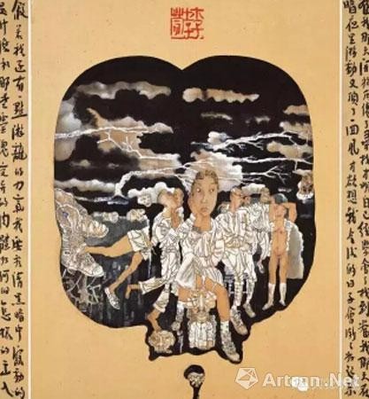 李孝萱的《伊甸园的故事》是一个系列的扇面画作品,数量达几十幅之多。画家在谈到这-批作品时说:“这系列扇面,大多是表现性爱的,促使我画这些画的兴趣,原因很多,很难说清楚,但我尊重的是人性本能中最真实的一面,从画面上看更多的是暗示,强化人们在对待”性“和接触”性“前后的种种心理因素和不同的态度。我所以尊重和崇尚性是因为它首先是生成人类的前提。这是任何伟大的人也逆转不了的,回避不了的自然规律,没有性就没有人类,相应地也就没有文明可言,究其原因,世界上任何事物的产生发展无一不是和”性“密切联系的,”性“本身是神圣的,伟大的。同样,我表现性也出于一种崇拜。”这一席话将画家的创作动机和思想说得十分明白。但这仅仅是认识这一系列作品的前提,真正要解读这些作品,还是要对作品进行深入的考察和研究。