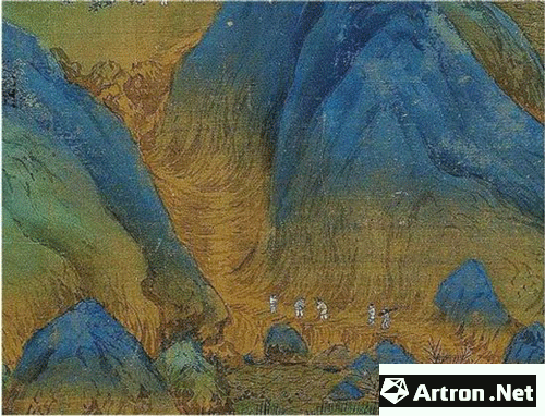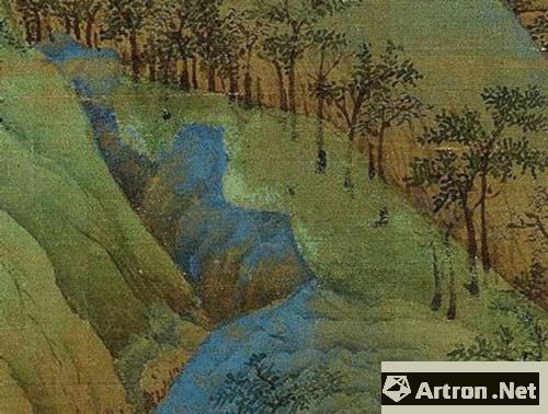 我们从这张画上会看到,像这个底下他留有这样的一些,笔墨的这样的一些痕迹,到这个地方已经是用这个色彩做成晕染,然后这个色彩的晕染它是有不同层次的,最开始是在这个皴法的基础上,做了这样一个赭石的铺垫,然后在上边再染这个石绿,石绿又是这样一个石青是这样的一个过程,我只是简单地说,但是每一步程序,每一遍染色其实都是很多遍数的,我们说的三矾九染,三矾九染是指的这样一个遍数的一个多重性。