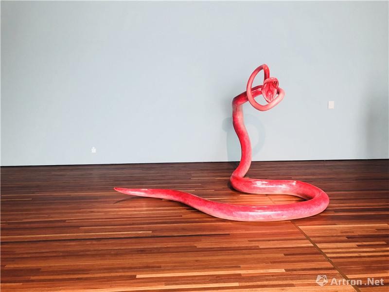 比如向京作品《行嗔》 的主角是一条暴怒的红色蟒蛇,它生而具有人的口腔和牙齿,充满暴虐的力量和行走的愤怒,昂头怒目凝视着观者,向观众展示出向京试图表现的主题——欲望和关系,展望的《第 86 尊圣像》可以看到“破与立”不断重复的历史。