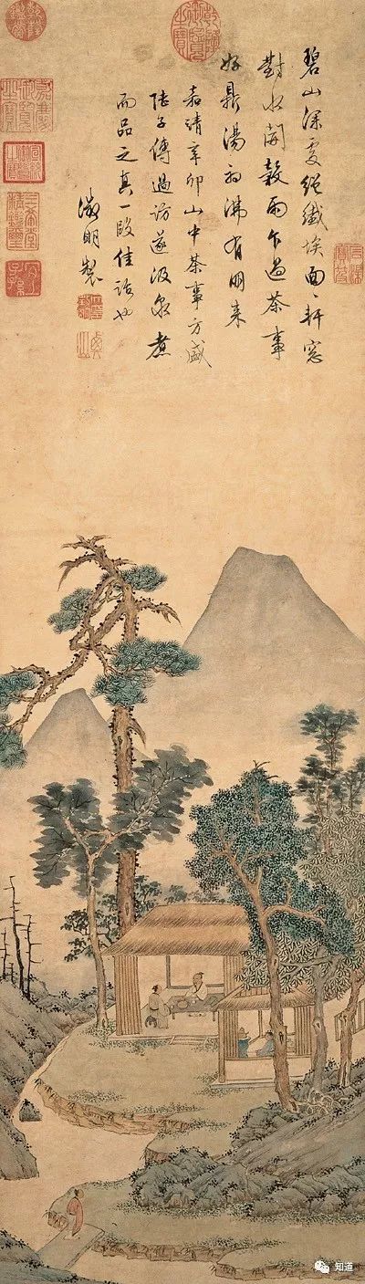 文征明 明代著名诗人、书画家,与祝允明、唐寅、徐祯卿四人合称“吴中四才子”,画史上又将他与沈周、唐寅、仇英合称“吴门四家”,擅长山水、人物、花鸟画。 文征明《品茶图》,画上自题七绝:“碧山深处绝尘埃,面面轩窗对水开。谷雨乍过茶事好,鼎汤初沸有朋来。”末识:“嘉靖辛卯,山中茶事方盛,陆子傅对访,遂汲泉煮而品之,真一段佳话也。”可知该画作于嘉靖辛卯(1531年),屋中品茶叙谈者当是文征明、陆子傅二人。