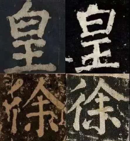 颜真卿《大唐中兴颂》(上左)、《元次山碑》(上右)、《八关斋会报德记》(下左)、《宋广平碑》(下右),字体分析(均书写於772年)
