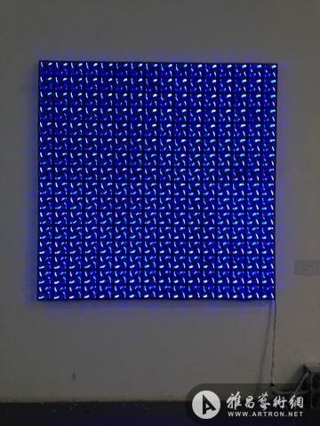 在塑料方凳装置的对面是由连续重复的电脑风扇构成的作品《蓝风》。与塑料凳子形成的平面方阵不同的是,有所有风扇共同吹出的风延展了作品的空间,包括每个小风扇上的四盏蓝色的灯共同形成视觉与触觉的综合感受。