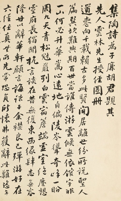 “《授经图》题就,奉呈乞正之。忧中不作韵语,集古或无嫌也。……弟近为先人卜兆,日居乡间。虽得数处,均价昂中止,伤哉贫也!子路亦云。噫!数日不晤,想道诣日增,此惟著安。晚学弟制赵之谦叩上。(见《赵之谦年谱》)”此信内容与赵之谦题词正相印合,“兆”指墓地,咸丰三年赵之谦父松筠卒,“卜兆”即寻墓地也。赵之谦因父亲之丧,无心绪作诗,所以集陶诗题《云林先生授经图》,则此书当作于咸丰三年即1853年赵之谦二十五岁时无疑也。“子廉”为胡秉元之子,具体身份无可稽考,或亦胡培系之别字耶?赵之谦此册题词洋洋数百字,规模颜鲁公,端严中不失俊秀,集诗也体现出青年赵之谦深厚的学养和才华,在目前所见公私所藏赵之谦手迹中,除上文所引信札外,尚有广东省博物馆所藏《行书茶经补注》六屏为明确题为癸丑年所作,则与此册题词均为赵之谦传世最早的书迹。