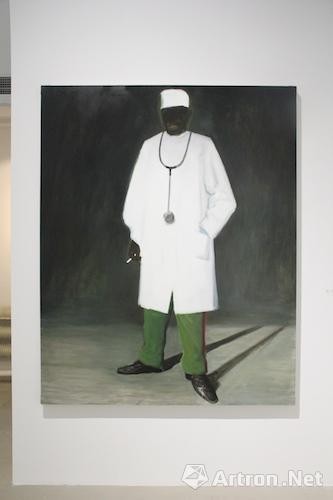 “对此,刘夏选择返回到具象绘画史中找寻继续实践的灵感,他像一个改写历史的时间旅行者,从提香、鲁本斯、委拉斯凯兹、布歇、普桑、库尔贝、马奈等等这些不同时期与风格的大师作品中,针对性的借用或者截取一些经典画作予以重新描绘,对于刘夏而言,他的这种针对性并非是在重温绘画彼时的荣耀,而是尝试如何从神圣与严肃的知识话语中解析出世俗的幽默与活力,例如他将马奈经典的暗部逻辑反向的运用在了一张虚构的穿着白色制服黑人医生立像,如同一张马奈画作的负片;而在一组名为《同卵未分裂》的画作中,刘夏故意将两个身体之间的空间压缩为一个平面,从负形那里规定正形的语义——而这种矜持的修辞,维系着刘夏作为画家的尊严。”