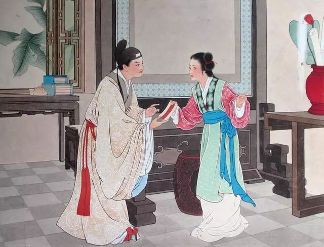 张生因思念而致病。莺莺让红娘前往探望,张生以信笺相托.莺莺回信,在诗中暗示张生,今晚在花园中与其相会。