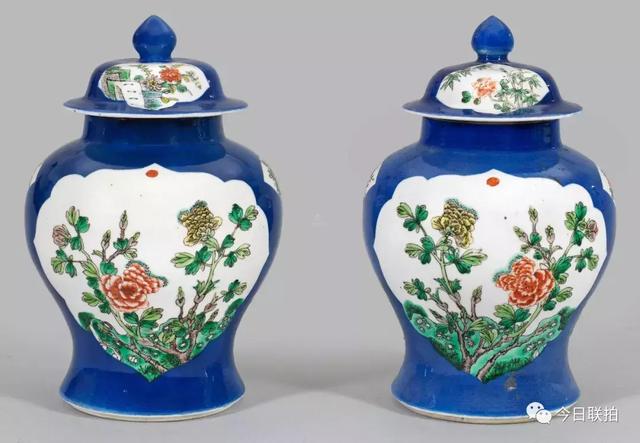 十八/十九世纪 蓝釉开光五彩花卉纹盖罐一对