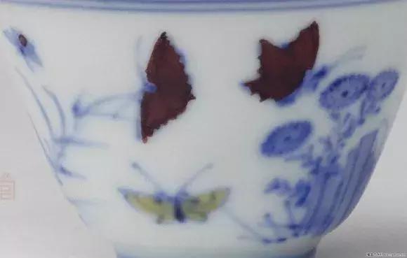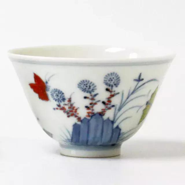 这是一只轻灵秀巧的斗彩瓷杯,在洁白细腻、薄如蝉翼的胎体上绘了两只蝴蝶在山石花草中蹁跹飞舞。