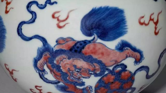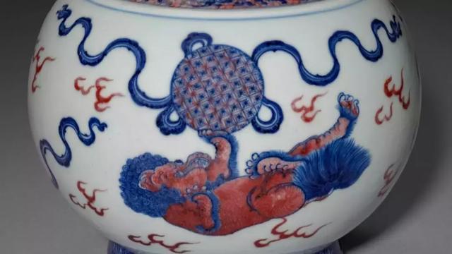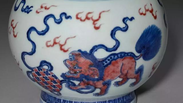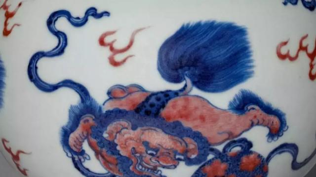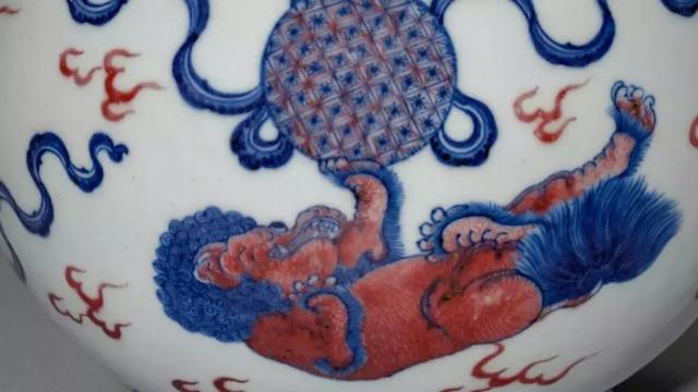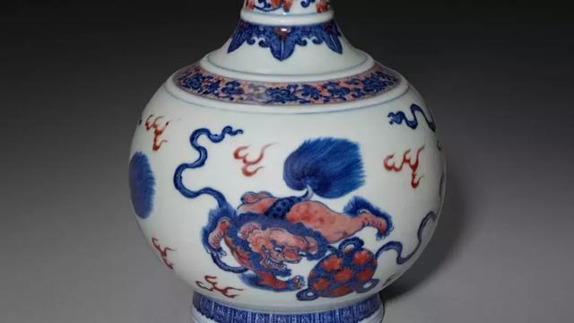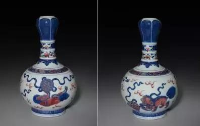 青花釉里红狮子戏球纹蒜头瓶