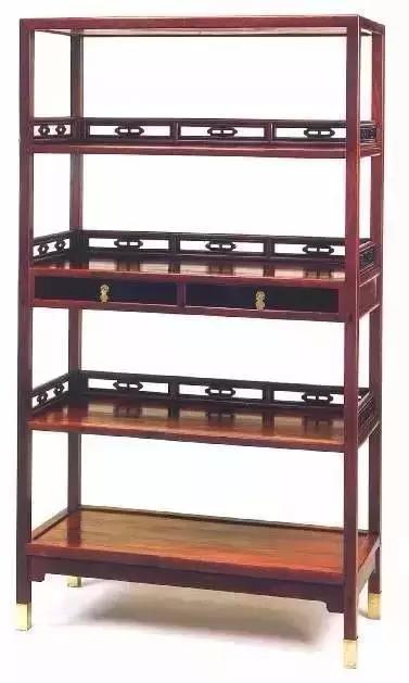 第二层格板下安扁而宽的抽屉两具,乌木作前脸,配以壶形白铜的吊牌。架格栏杆之矮,抽屉之扁,想是为求空灵疏朗之效,而乌木与黄花梨相配,黝黑浓黄,相映成趣。