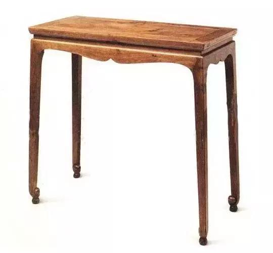 小条桌长度不及一米,牙条正中锼出壶门拱尖,与束腰为一木连做,四面不设枨。此桌足端马蹄向内卷转,以圆球为结束,足下并承以底部切平的圆球。圆球的支垫再加上足腿的修筑,予人翼然飘举之感。