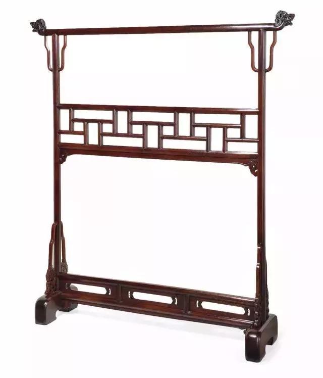 灵芝纹棂格中牌子黄花梨衣架,尺寸不大,长141.5厘米,高162厘米,深33.5厘米,骤看不大起眼,细味就能领悟到匠师的意匠经营。高盆架搭脑翘头两端颇常见的灵芝纹,在这衣架上有不同手法的演绎,别具风韵。