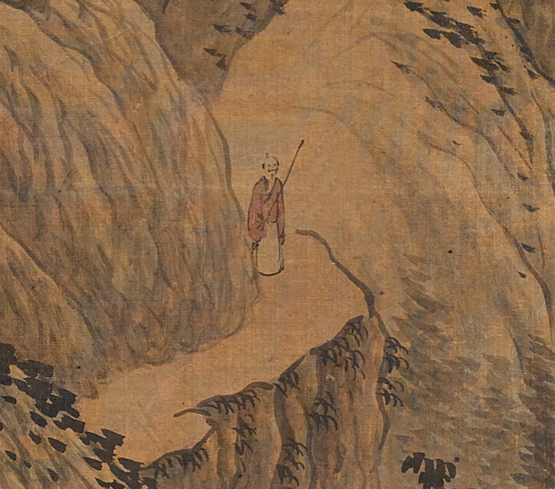 此图描绘秋山隐居之景,构图繁复,景物众多,正秦氏诗堂所谓“布置精严,气韵浑秀,直笔长皴,犹传北宋风格”。画中危峰幽谷,重峦叠嶂,烟云弥漫,茂树丛生。村居琳宇,溪桥流水,点缀其间,高士策杖闲行,再现了职业画家眼中的可游可居的精神家园。画中笔墨皴法取法宋元,山体以王蒙为宗,树石融合北宗画法,淡墨湿笔,皴染细腻,将传统绘画技巧融入写实江南真山水之中,营造出一种峰峦隐显、若含烟霭之景,正老杜所谓“元气淋漓障犹湿”之境也。由此亦可得知武丹绝非仅是技法高明的画师,他身上兼具职业画家的功力和文人画家的素养,在金陵诸家中,自应占有重要一席。