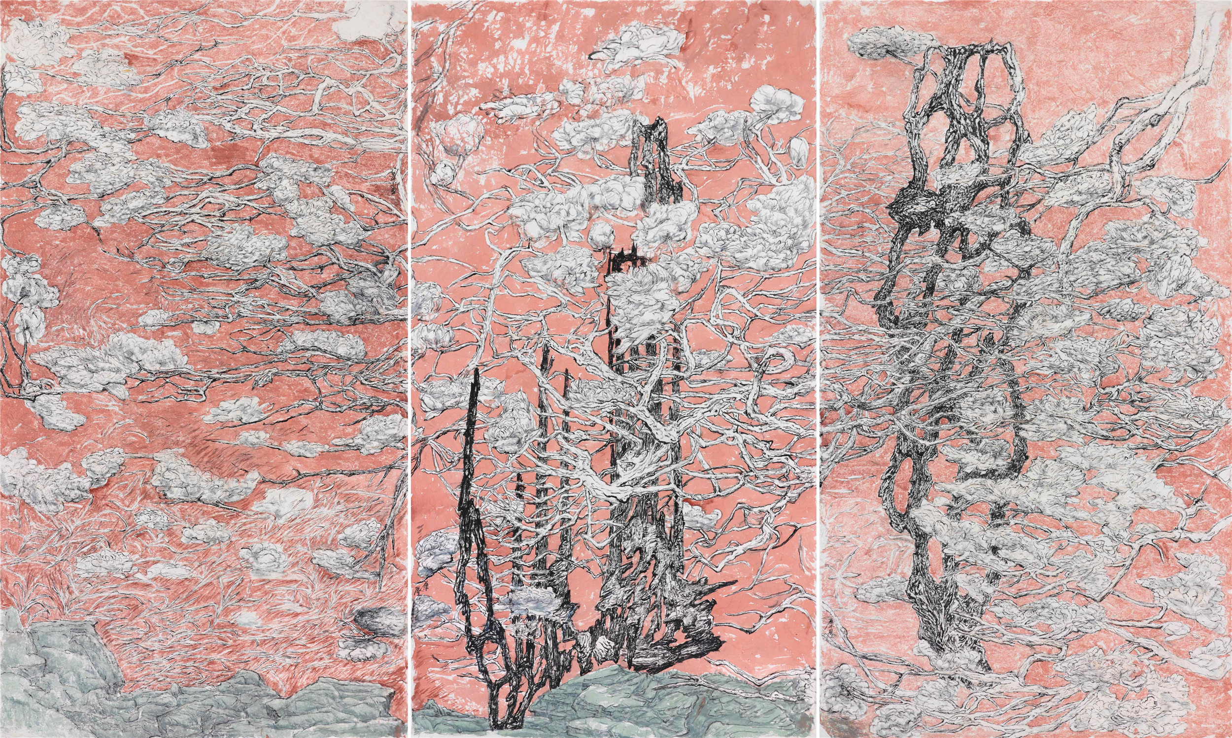 彭康隆的中国画传统学养师从国画大家何怀硕。由北宋山水巨幅构图形式的感豁,融合石涛、髡残、黄宾虹传统山水一脉相承的滋养。他的水墨绘画以笔为骨,墨为肉,并不拘泥于传统图式的窠臼,画面笔墨密集、张扬,元气淋漓。常以巨大花卉草木置于要紧处,又以刻画精微的山石,在峰回路转间形成超越现实场景,而向内关照的内省。近期的“集大成,得卓然”个展中两幅长手卷《括囊无咎》、《含章可贞》,巨幅立轴《隆崇赋》,以及两幅横构图巨幅画卷《山花浪漫时》、《白露烁烁》,最能彰显其生命状态的佳作。