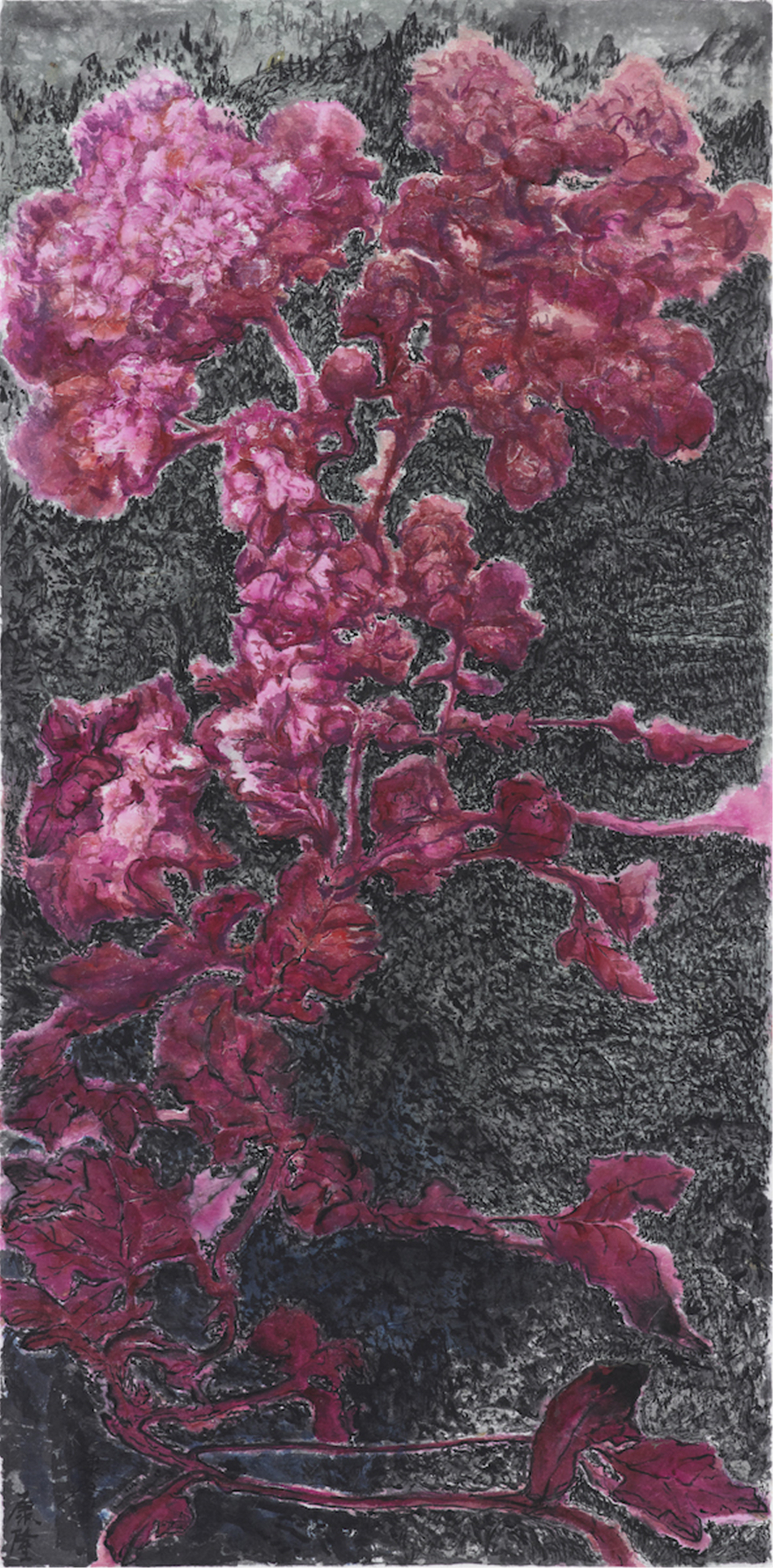 《苍郁的花火》, 2023, 纸本水墨设色, 70 x 140 cm