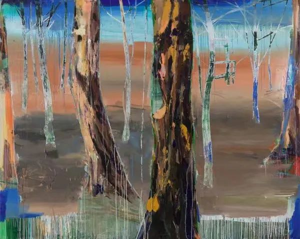 卢琳的绘画,介于具象和抽象之间,似乎有叙事,驻足推敲时又无迹可寻,因为充溢画面的主要是诗性的情绪,指向一言难尽的生命感怀。他用阔大的笔触、斑驳的肌理、高纯度却基调阴郁的色彩,营造出一幕幕壮阔芜杂的天地。简约轮廓勾划出的具象的人和物,在其中渺小、微弱,孤独寂寥的或动或静着……