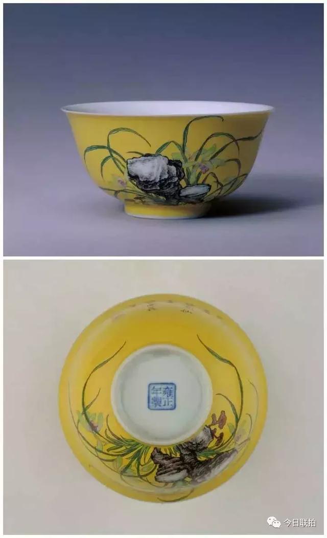 淡黄地珐琅彩兰石纹碗