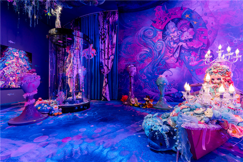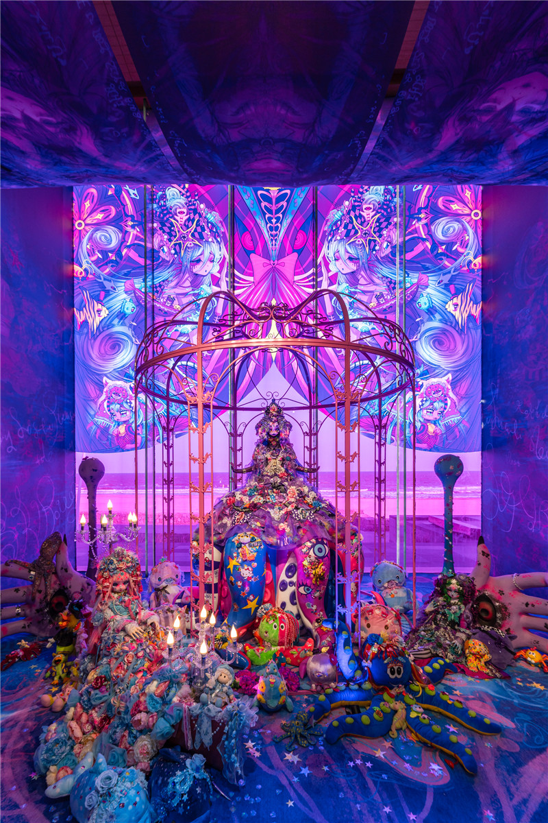侧面墙上是她的巨幅布面丙烯、数码制作的绘画《自厌游戏》。在这幅4.2米的巨幅绘画中,“我”通过对“自己”加工、改造、生育、切割、对决等使得“我”能够不断地循环。这是因为“我”的意识被信息世界里的无数信息和记忆所影响着,然后它会进而影响“我的身体”在一个虚空世界里继续分裂。她在虚空世界中表达的一切,也正是现实世界中对于自己真实状态的影射。画中的世界是一个个魔女的结界,封存着无数交织的感受,不论是狂喜还是悲伤,都是对它们所在世界图景的控诉。