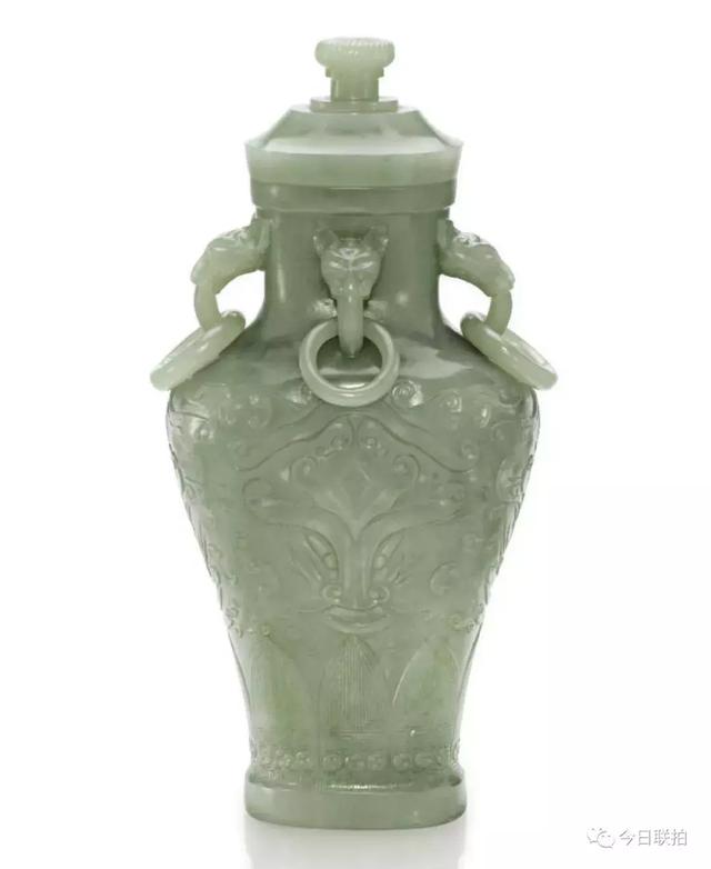 清十九世纪 灰青玉仿古纹兽面耳活环盖瓶